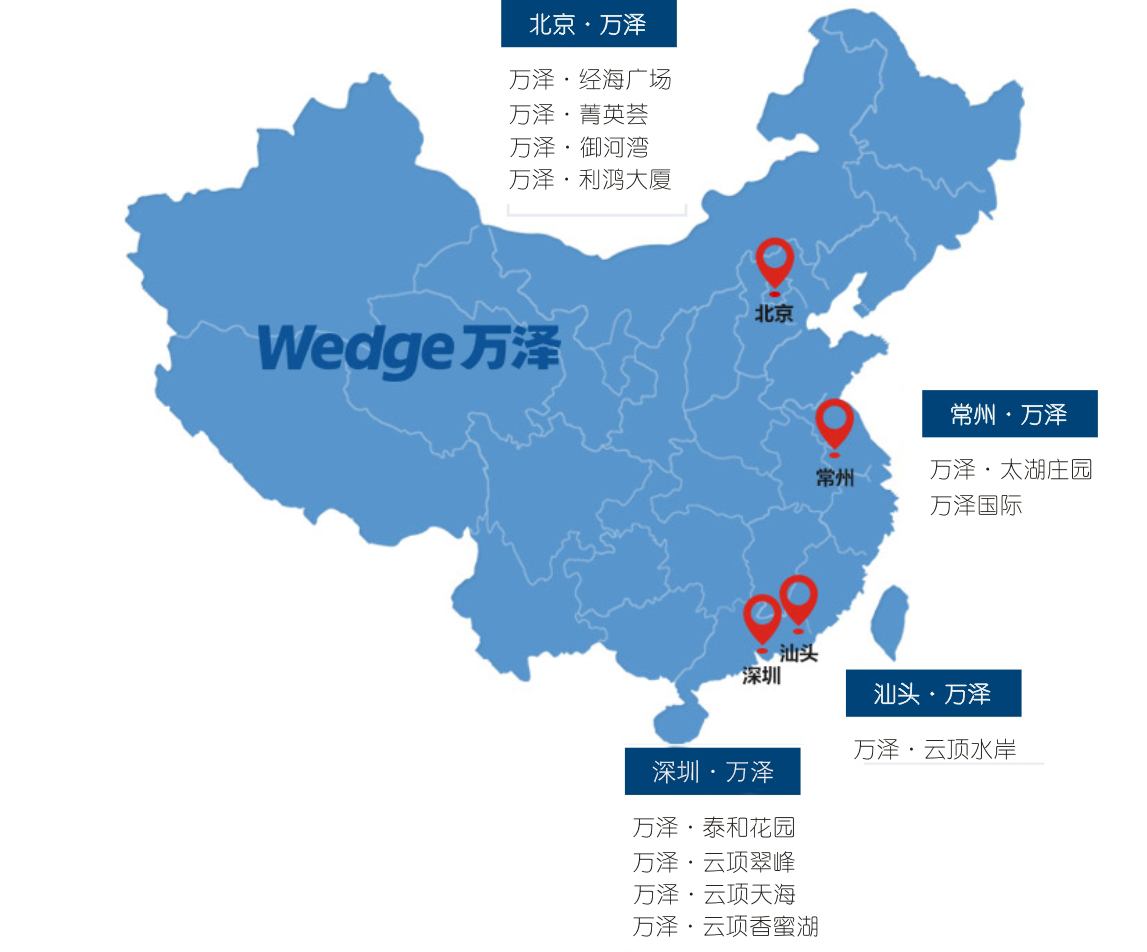 万泽地产业务始于1996年,经过20年的发展,树立了“中国生态人居倡导者”的品牌愿景和“依自然而生”的品牌理念,形成了以环境、养生、空间、科技、人文、物管六大价值为项目规划出发点的“6S生态人居价值体系”,逐步发展成为集房地产综合开发、建材经营、装饰装修、物业管理于一体的集团企业。公司先后布局珠三角、京津唐、长三角等三大区域,各地土地储备达900多万平方米,在深圳、北京、常州、汕头、呼和浩特等城市建立了城市公司,形成了立足深圳、面向全国的发展架构。